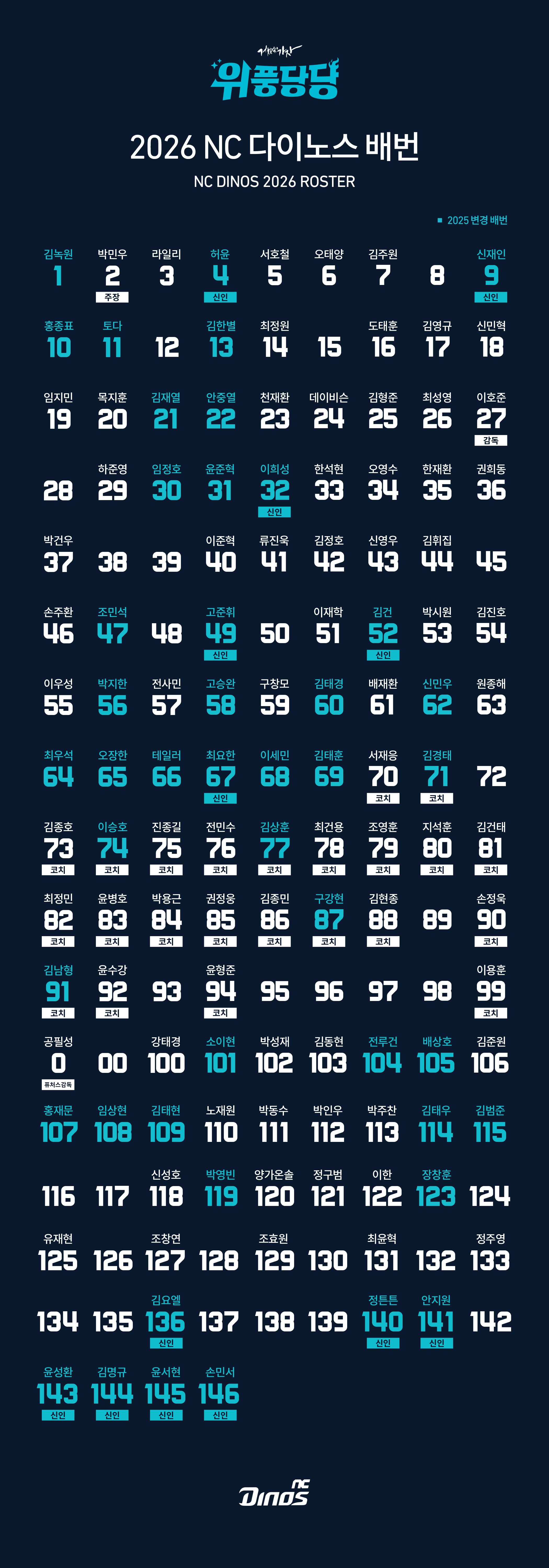 [공지] 2026시즌 NC 다이노스 선수단 등번호