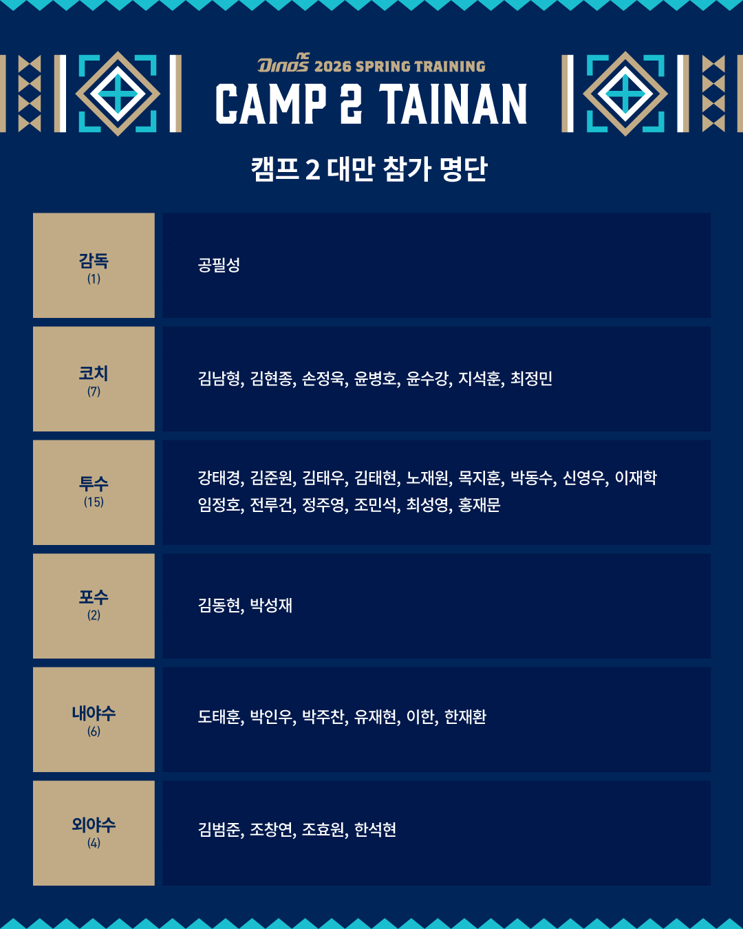 이번 C팀 캠프에는 공필성 C팀 감독을 비롯해 코칭스태프 11명(트레이닝 코치 3명 포함)과 선수 27명 등 총 44명이 참가합니다.